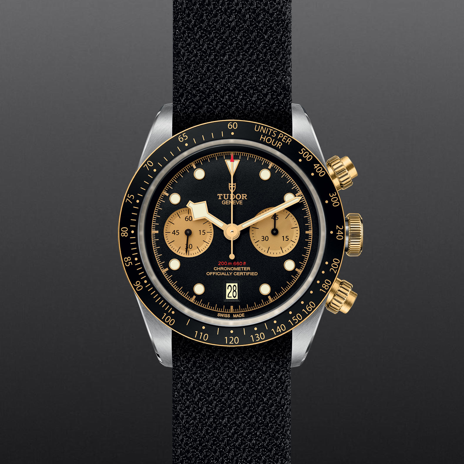 Screw-down winding crown with the TUDOR rose in relief. Yellow gold screw-down pushers at 2 and 4 o’clock. Steel covered by a 0.3mm 18 ct yellow gold cap