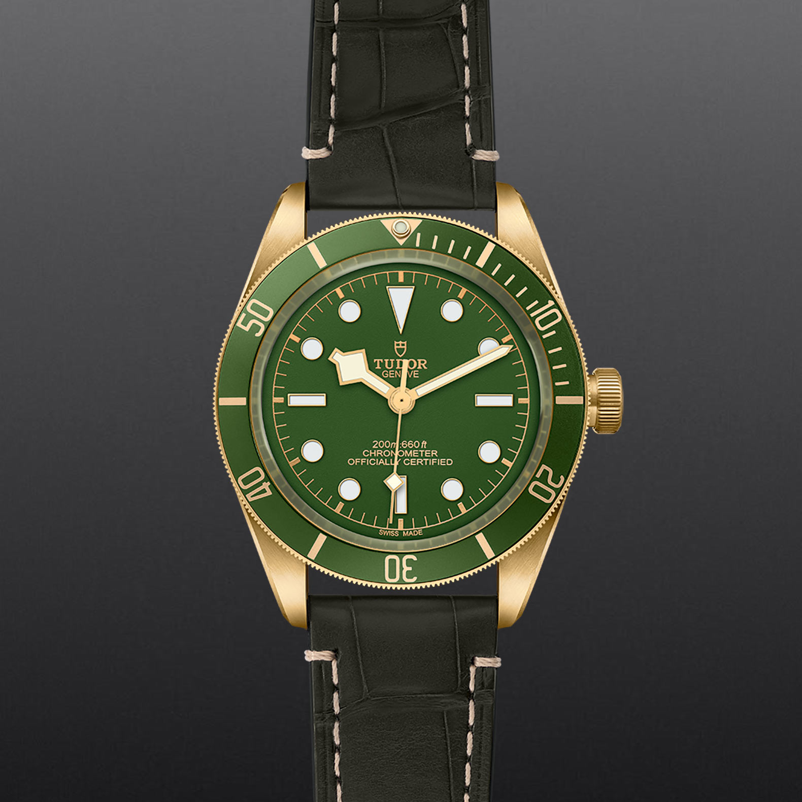 Unidirectional rotatable bezel in 18 ct yellow gold with 60-minute graduated disc in matt green anodised aluminium and gold gilded markings and numerals