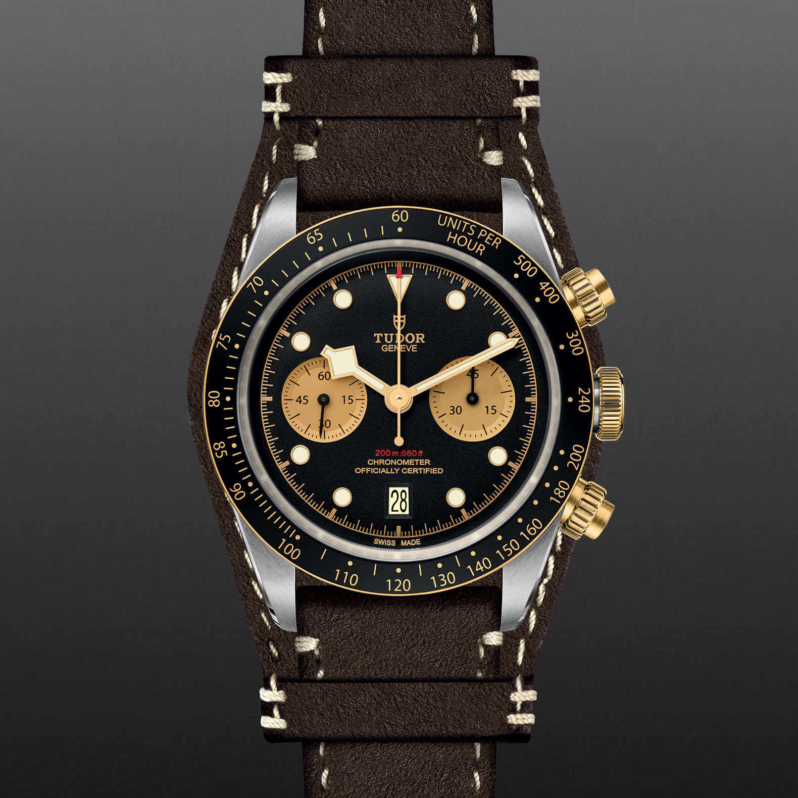 旋入式上链表冠,饰以浮雕帝舵表玫瑰标志;黄金旋入式按钮位于2点钟及4点钟位置:精钢覆有0.3毫米18K黄金薄层