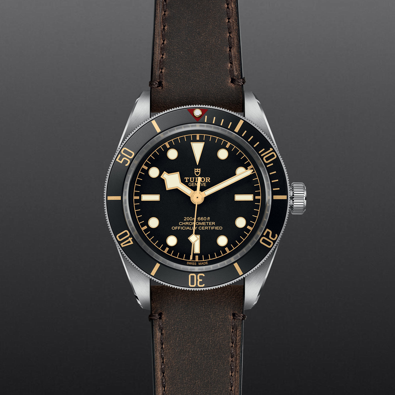 钢旋入式上链表冠,饰以浮雕帝舵表玫瑰标志,配圆纹磨砂钢上链表冠轴