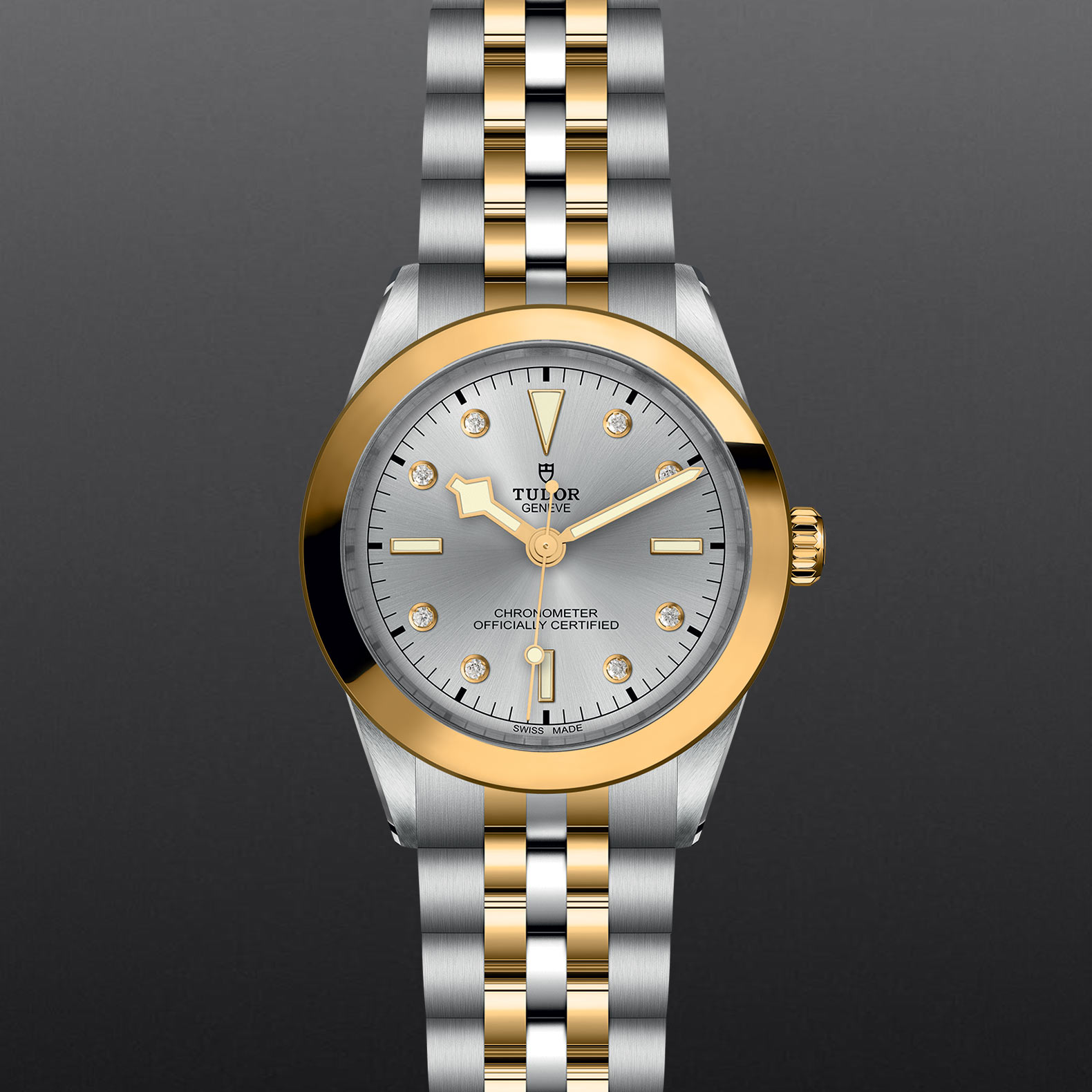 黄金中央链节位于6点钟及12点钟位置;其他精钢中央链节覆有0.2毫米18K黄金薄层;“T-fit”摺扣,配安全扣;带扣上的标志以黄金打造
