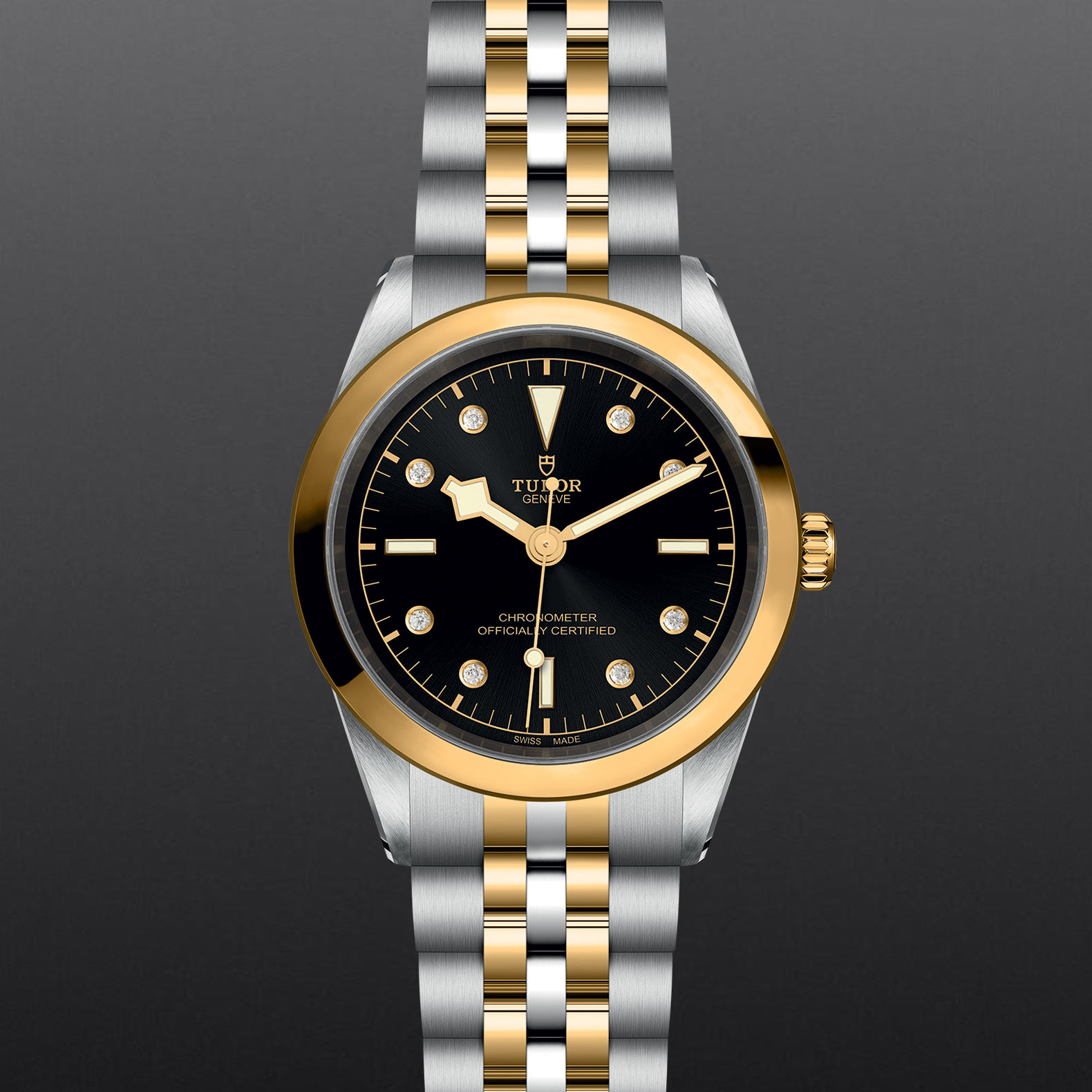 黄金中央链节位于6点钟及12点钟位置;其他精钢中央链节覆有0.2毫米18K黄金薄层;“T-fit”摺扣,配安全扣;带扣上的标志以黄金打造