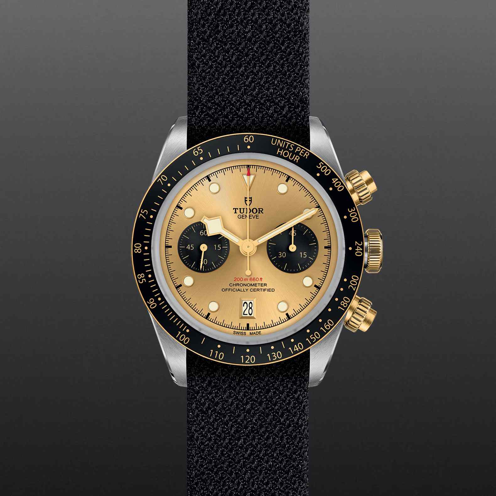 混合型Black Bay Chrono將Black Bay系列代表的潛水錶傳統與賽車計時錶的精髓相結合。鋼錶殼保留了Black Bay系列的顯著特徵,其按鈕的設計靈感則源於第一代帝舵計時腕錶。圓紋磨砂鋼固定外圈刻有測速計刻度,使這款運動型計時腕錶的外觀更趨完備。