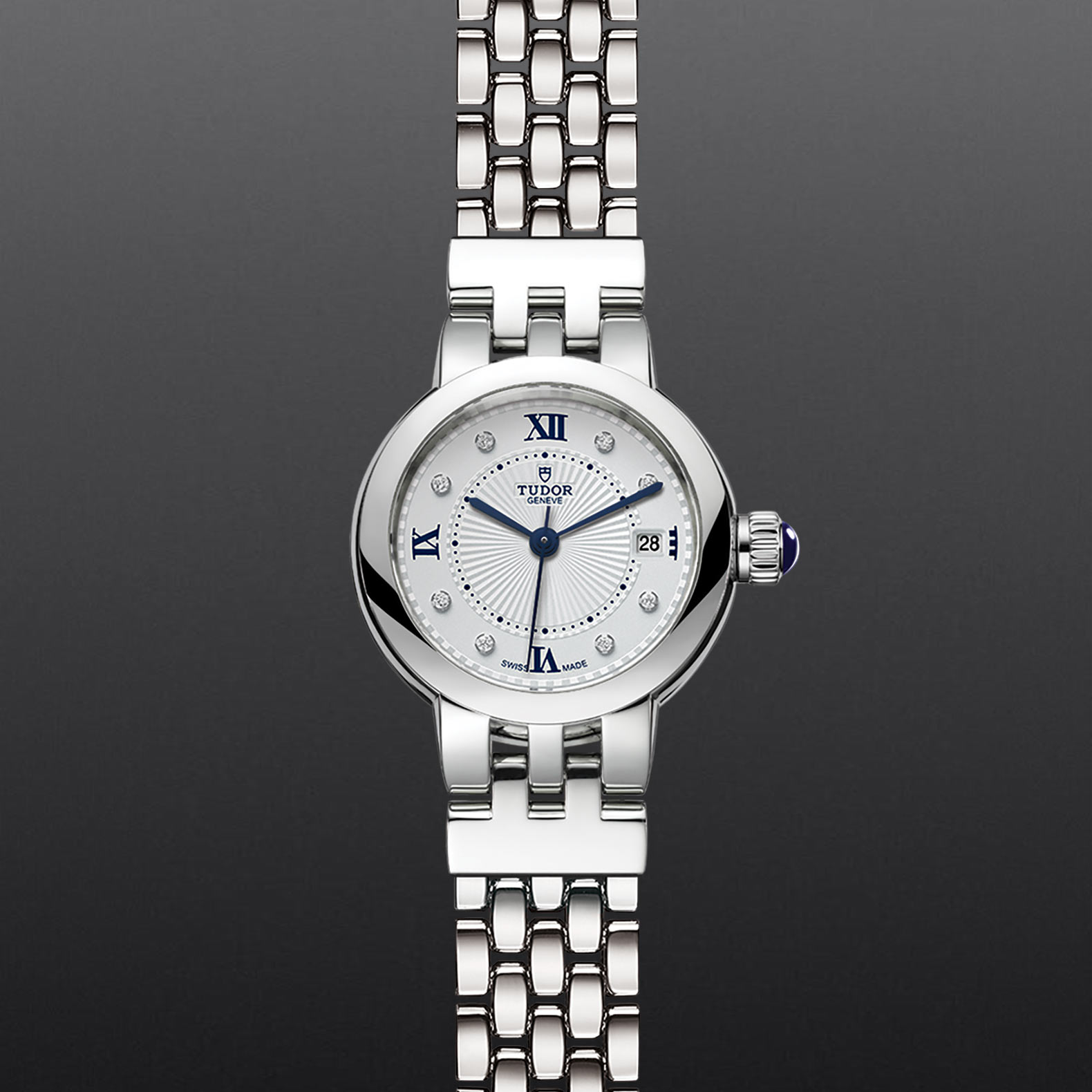 鋼旋入式上鏈錶冠,飾以透明圓拱形藍色尖晶石