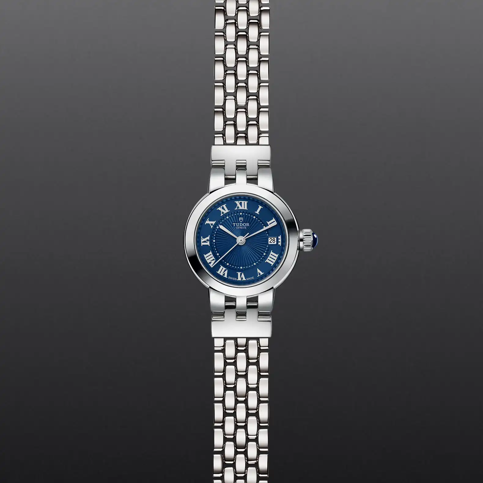 精鋼旋入式上鏈錶冠,飾以透明圓拱形藍色尖晶石
