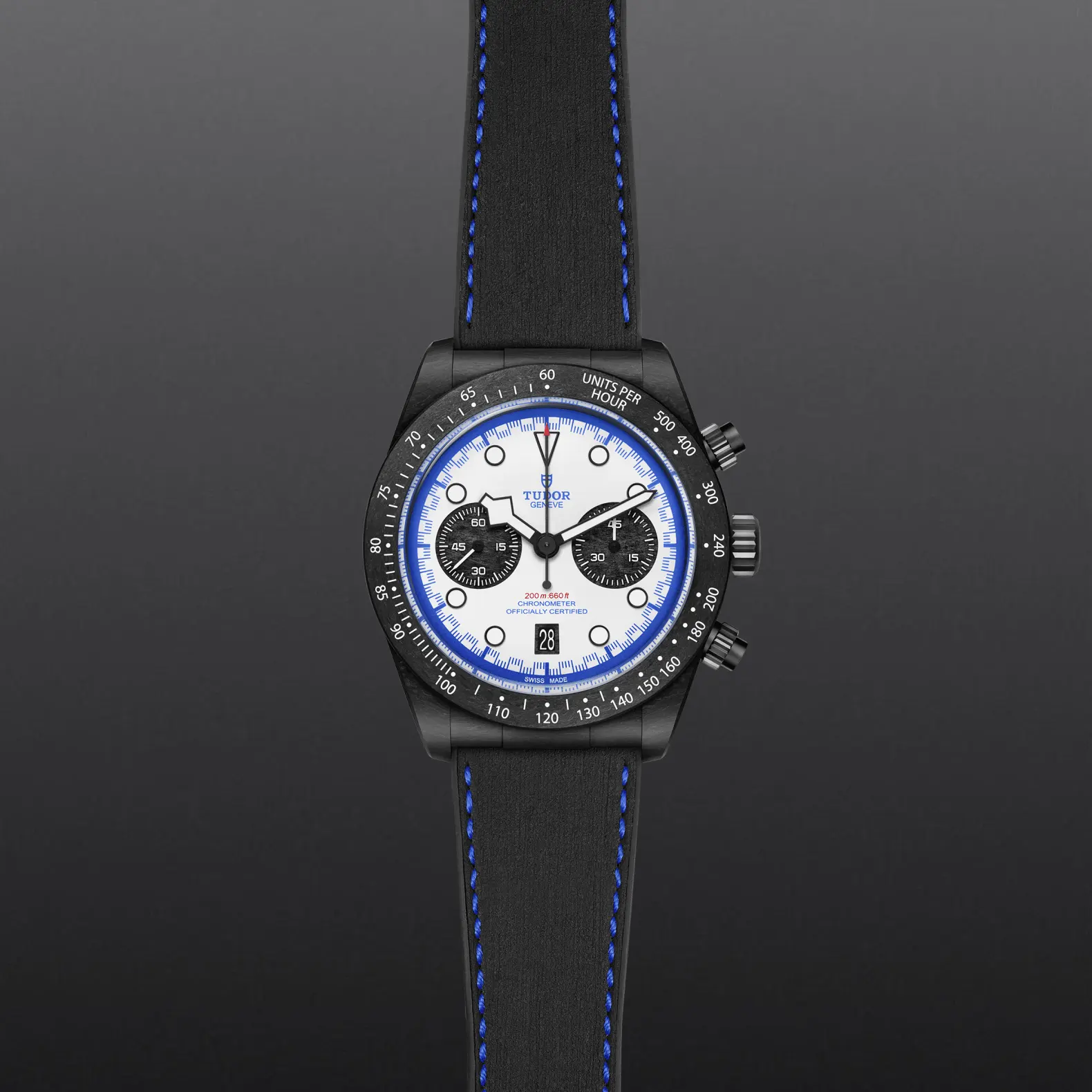 這款全新的賽車計時腕錶配備高性能碳纖維錶殼。從「極速白」錶面到計時腕錶所用的碳纖維材質,其整體美學風格啟發自Visa Cash App Racing Bulls車隊的VCARB02賽車塗裝。